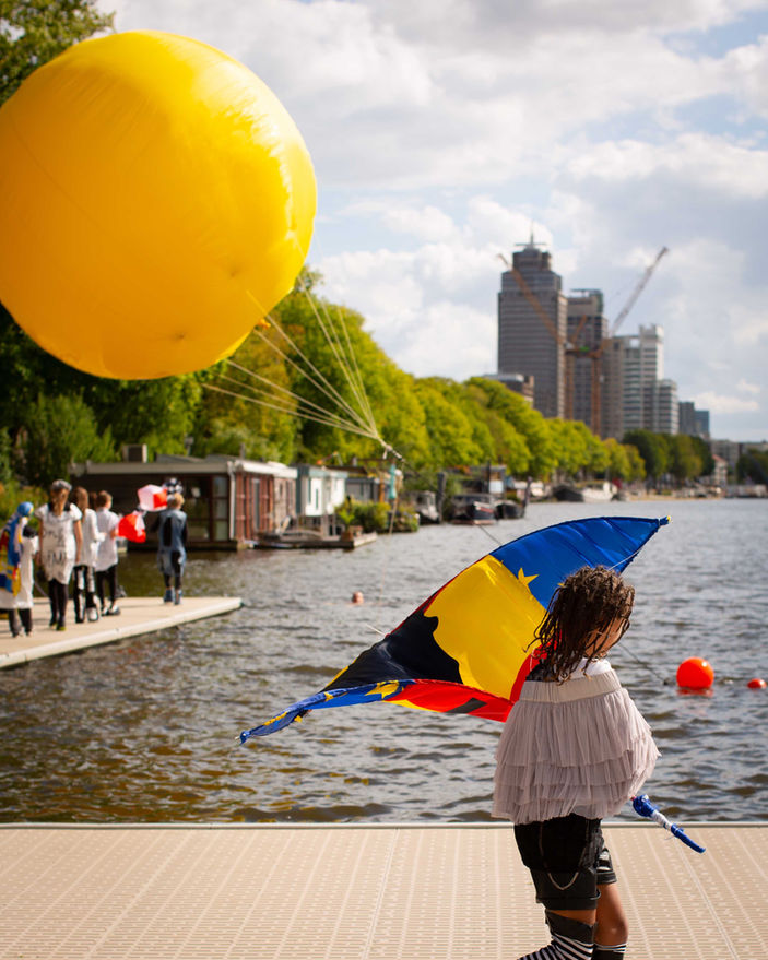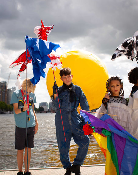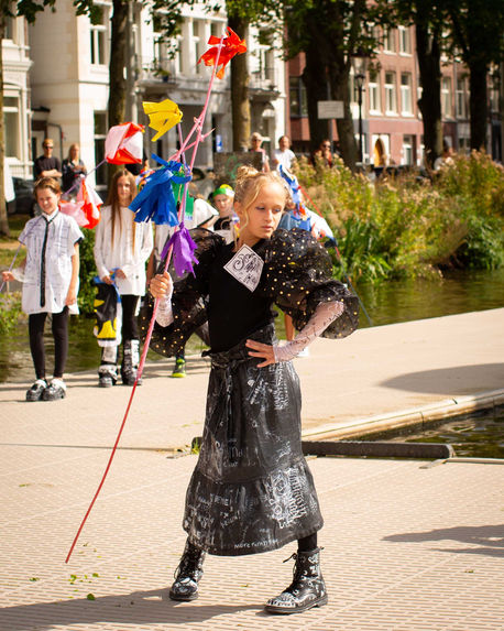 The performance took place at rowing club De Hoop, where the space was transformed into a moving manifesto guided by the children’s own creative processes. Their self-made garments — constructed from repurposed textiles, found materials and ad-hoc assemblage — introduced a vocabulary of play, improvisation and direct action. Rather than functioning as costumes, these pieces articulated the project’s underlying principles of reuse, agency and collective making.